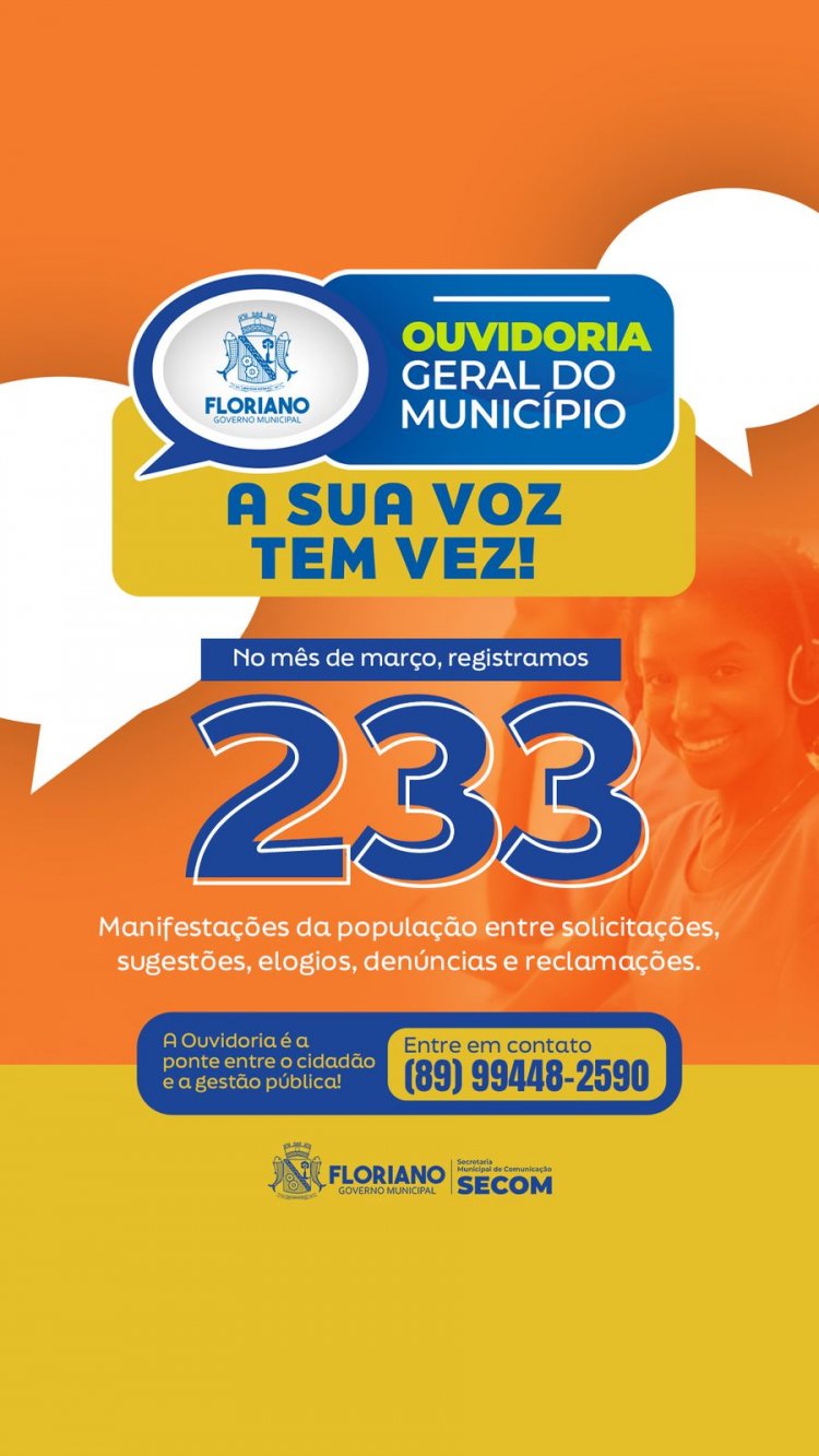 A Ouvidoria-Geral do Município de Floriano contabilizou, no mês de março, 233 registros de manifestações da população, demonstrando o fortalecimento da comunicação direta entre a gestão municipal e os cidadãos, e consolidando-se como um espaço acessível e eficiente para atender as demandas da comunidade.