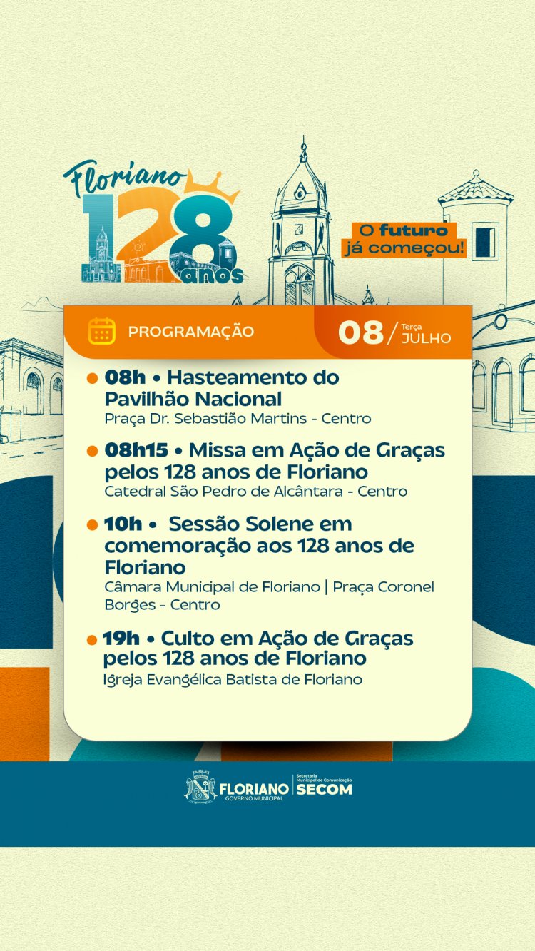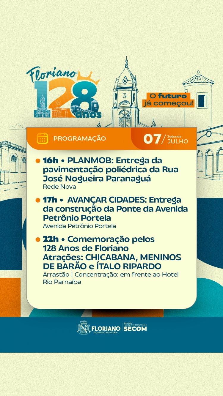 Entre os destaques, estão entregas de obras estruturantes em diversos bairros, como a ponte da Rua Petrônio Portela; mutirões de cidadania com oferta de serviços à população, o Floriano em Ação e o lançamento do Orçamento Participativo de Floriano; competições esportivas, como a Copa Floriano; e atividades culturais, como o Circuito Junino - Arraiá da Cidade. O ponto alto das comemorações será no dia 07 de julho, com um grande arrastão saindo do Hotel Rio Parnaíba percorrendo as ruas da cidade ao som da banda Chicabana, seguido de festa no Cais da Beira-Rio com os shows de Meninos de Barão e Ítalo Ripardo.